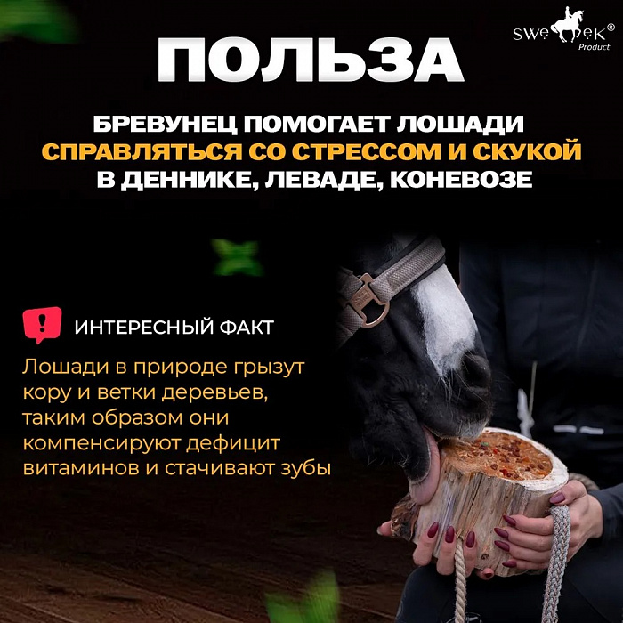 Многофункциональный Бревунец (лизунец совмещенный с деревянной основой) позволит вашей лошади не только сбрасывать напряжение в деннике и получать поощрение-лакомство, но и чесаться. Игрушка полностью безопасна и натуральна. Натуральный пеньковый толстый шнур в комплекте. Игрушка достаточно тяжелая, что защитит ее от подкидывания. Диаметр 14 см, высота 12 см.