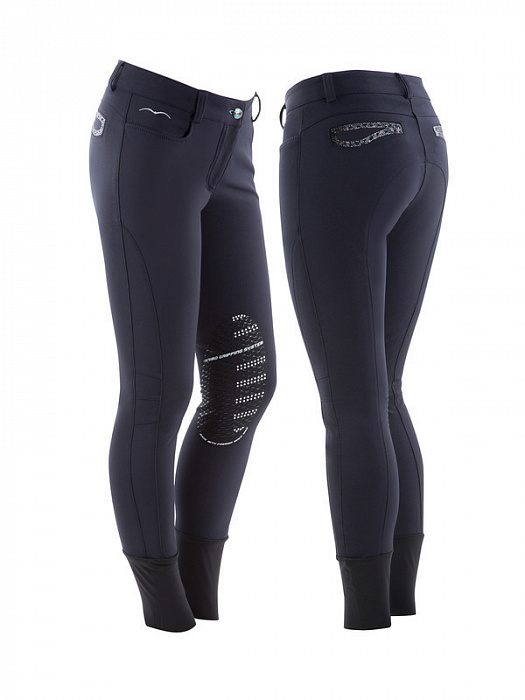 Тонкие эластичные бриджи с тонкой силиконовой коленной леей. Бриджи имеют украшения на задних карманах стразами в цвет. Стазы некрупные не вычурные, однако интересно блестят при движении. Все швы выполнены в минималистичном стиле нитками в цвет ткани. Полностью однотонные бриджи садятся прекрасно по любой фигуре. Посадка средняя на бедрах и чуть выше.