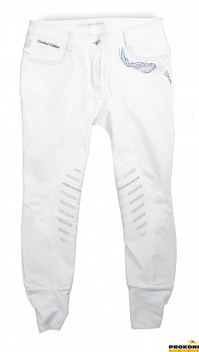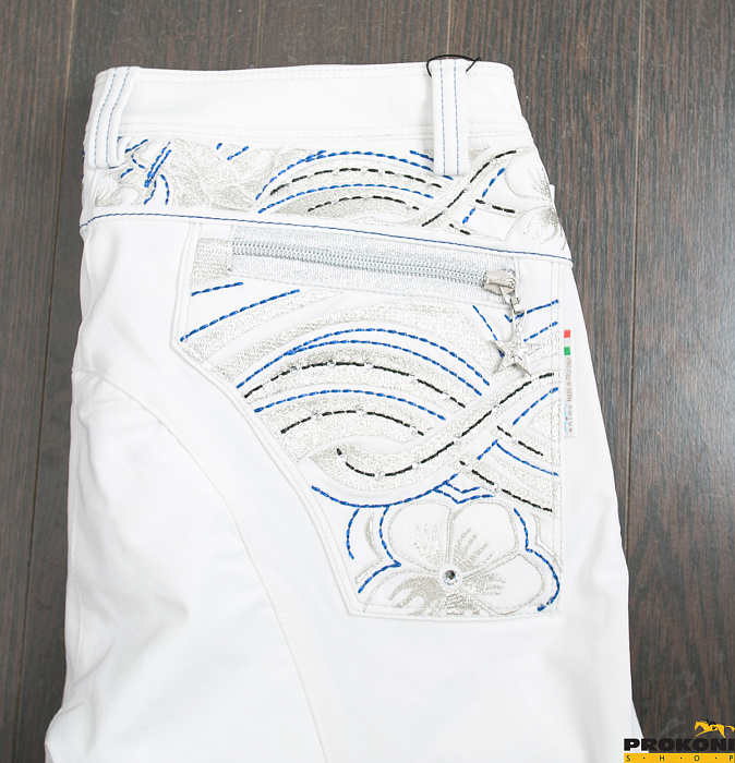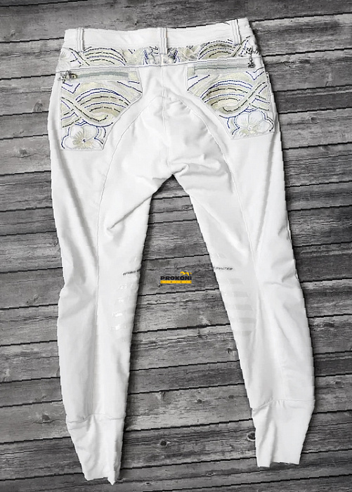 Белые бриджи не обязательно должны быть одинаковые у всех. Эти белые бриджи имеют яркие украшения на карманах.