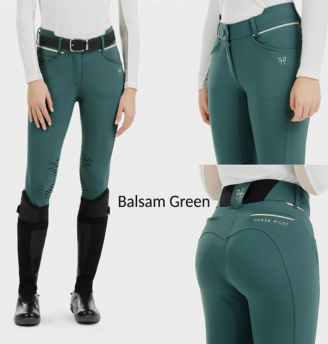 Бриджи имеют высокую посадку сзади и слегка укороченную спереди - это сделано специально для удобства всданика ездящего в полевой посадке. В области поясницы широкая резинка. Застежка - молния с крючком-блокировкой и дублирующей кнопкой.