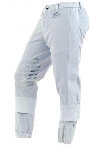 Унисекс штаны-самосбросы с силиконовой коленной леей для выступлений в непогоду. На левой и правой штанине сбоку молнии, с защитным клапаном. Сама ткань штанов проклеенная, ветро-водоустойчивая. В талии плотная резинка, ширинка на молнии. В районе икры "юбка" для надевания ее поверх сапога. Сзади штанов по правую руку имеется карман на липучке. Пререди два кармана на молнии закрытые клапаном от воды.