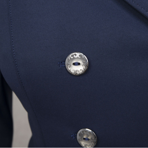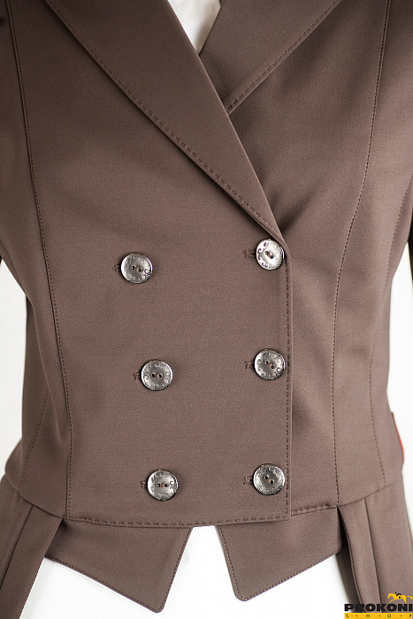 Пуговицы спереди продублированы скрытой молнией для идеальной корсетной посадки на всаднике.