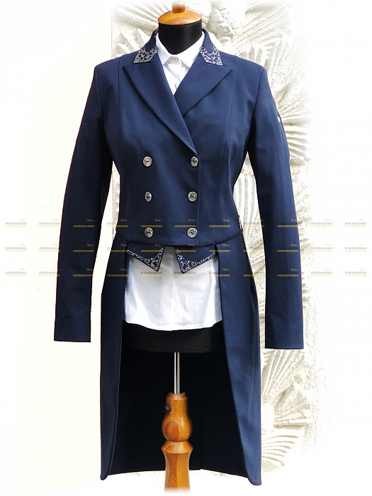 Оригинальный фрак синего цвета с воротником и фалдами украшенными мелкими стразами синего цвета