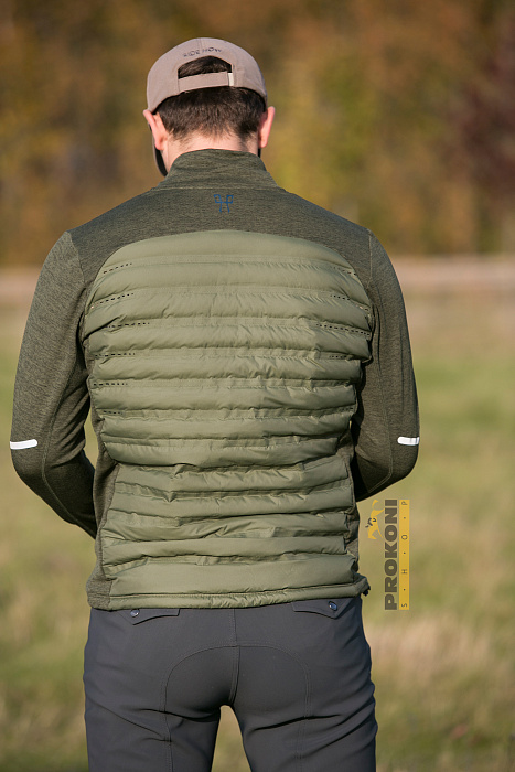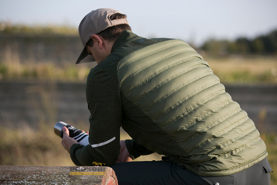 Стеганный перед и спинка с пухом внутри обеспечивает малый вес изделия и останавливает холод.
