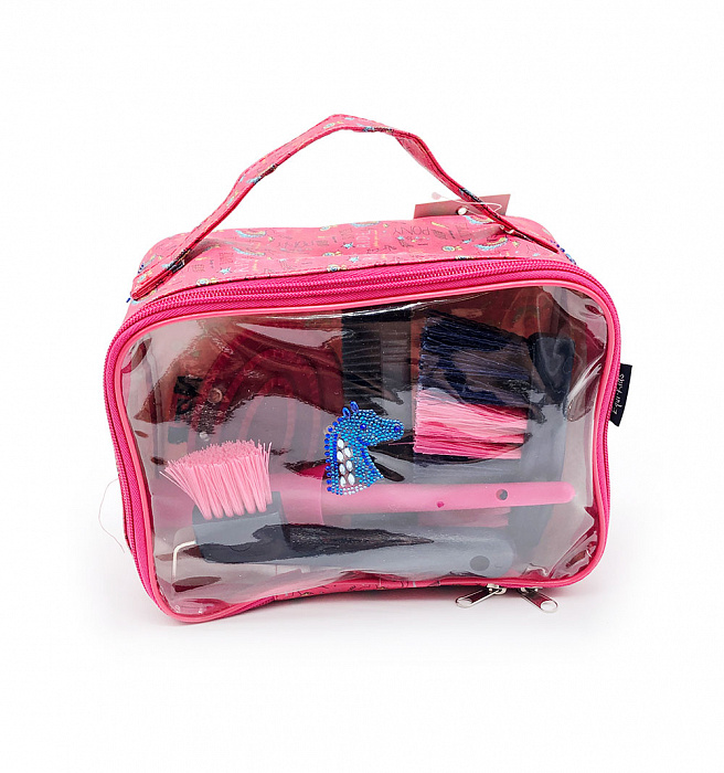Симпатичный детский набор в сумочке добавит приятных моментов в занятиях ребенка с лошадью или пони. Набор включает в себя все необходимое: копытный крючок, гребень для гривы и хвоста, щетка, скребница и кисточка для копыт. Весь набор выполнен в розово-синих цветах.