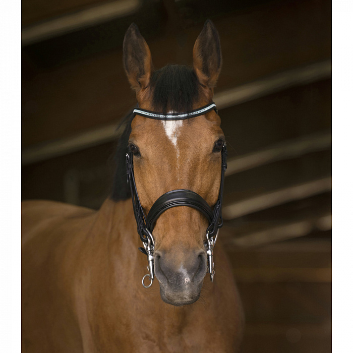 Оголовье Norton Pro Tiara Bridle отличается красивым капсюлем , украшенным блестящей каймой, и налобным ремнем, украшенным стразами и окаймленной двумя тонкими синими линиями.