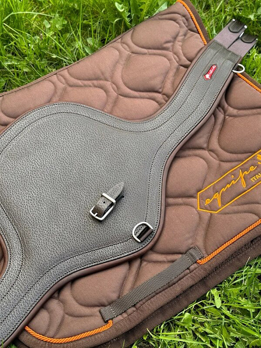 Кожаная подпруга Equipe с полукруглым фартуком имеет резинки с двух сторон для равномерного натяжения, резинки нарочно разной длины по анатомической фрме живота (первая короче второй), кольца по бокам...