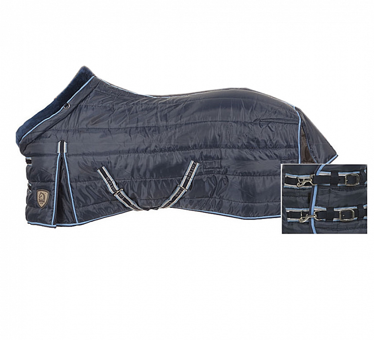 Горизонтально простеганная внешняя часть из нейлона плотностью 420D и наполнитель из полиэстера 330 г прекрасно справляются с холодом внутри конюшни. Попона оснащена клапаном для хвоста, удобной шеей с мягкой синтетической овечьей шерстью с подкладкой в холке, высокими передними шаговыми вытачками для ног, двойными нагрудными ремнями с карабинами, D-образными кольцами и пряжками с дополнительной поддержкой на липучках между ремнями. Перекрестные подбрюшные ремни с внутренней эластичной вставкой возле Т-образного крючка, в цвет отделки дополняют комфорт; эластичные ремни для ног с крючками помогут удержать попону на месте даже у активной лошади.