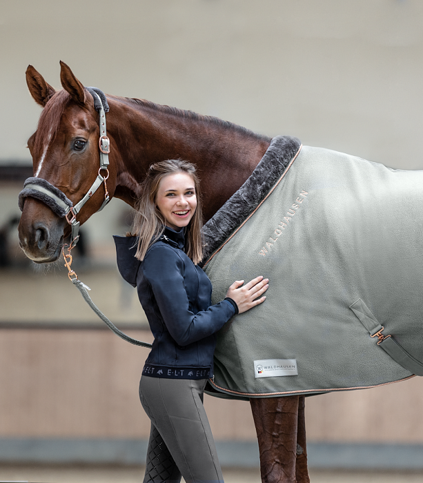 Элегантная флисовая попона с воротником из мягкого синтетического меха и высококачественным флисом, предотвращающим образование катышков, обеспечивает оптимальный отвод влаги. Шнур из розового или золотого золота по канту, вышивка из розового или золотого цвета вдоль горловины и застежки из розового золота придают изделию элегантный вид. Съемные поперечные ремни. Сочетается с коллекцией Modern Rosé