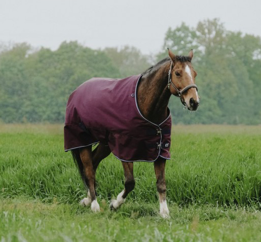 Водонепроницаемая и дышащая попона из полиэстера рипстоп плотностью 1200 денье и наполнителем 150 гр с проклеенными швами и нейлоновой подкладкой. Имеет большой водонепроницаемый клапан на хвосте со встроенным светоотражающим ремнем, синтетическую овчинную подкладку на холке внутри попоны, подбрюшные и бедренные регулируемые. Быстросъемная застежка на груди, усиленная самозатягивающимися лентами.