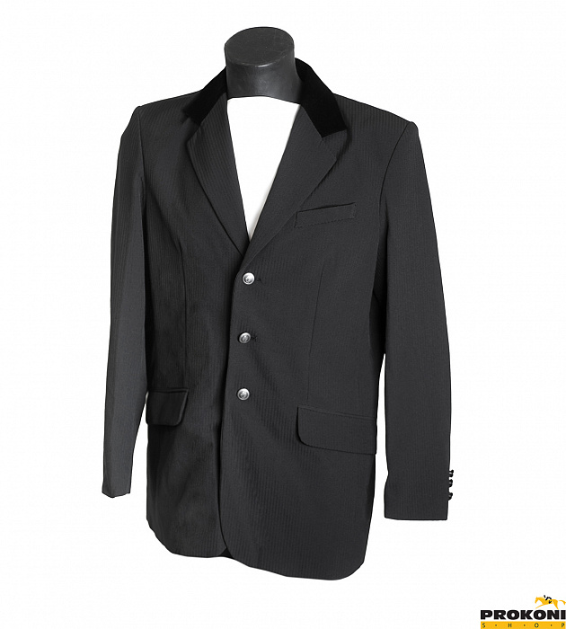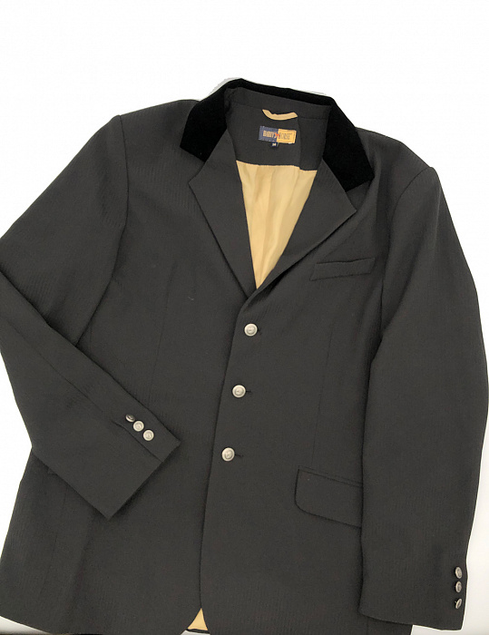 Классический черный редингот из полиэстера на пуговицах. Ткань в слабовыраженную полоску.