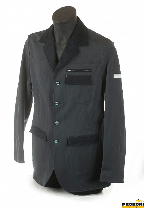 Темный редингот без подкладки в мелкую полоску из синтетической достаточно плотной, но при этом тянущейся ткани. Имеет вставки на карманах и воротнике из алькантары.