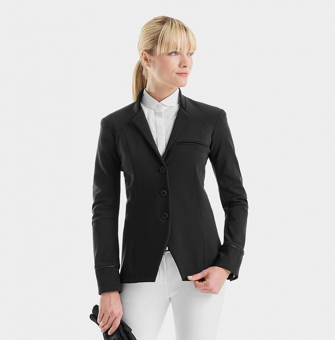 Тонкий редингот из эластичной ткани, посадка как у прежних моделей, но более строгий дизайн. Рукав анатомически скроен,черные однотонные матовые пуговицы, воротник стойка, отвороты на кнопках, идеальная конкурная посадка. Редингот так же подойдет в выездку.