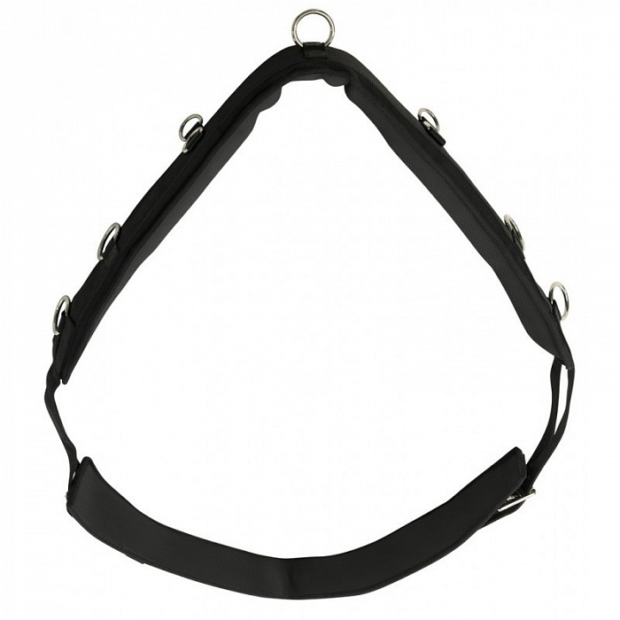 Синтетическая рабочая седёлка 10 см с резиновыми накладками со стороны холки и съемной подпругой с толстой неопреновой подкладкой. 9 никелированных колец по всей длине седёлки и 2 дополнительных кольца на подпруге. Максимальная регулировка длины до 220 см и минимальная длина обхвата 175 см.