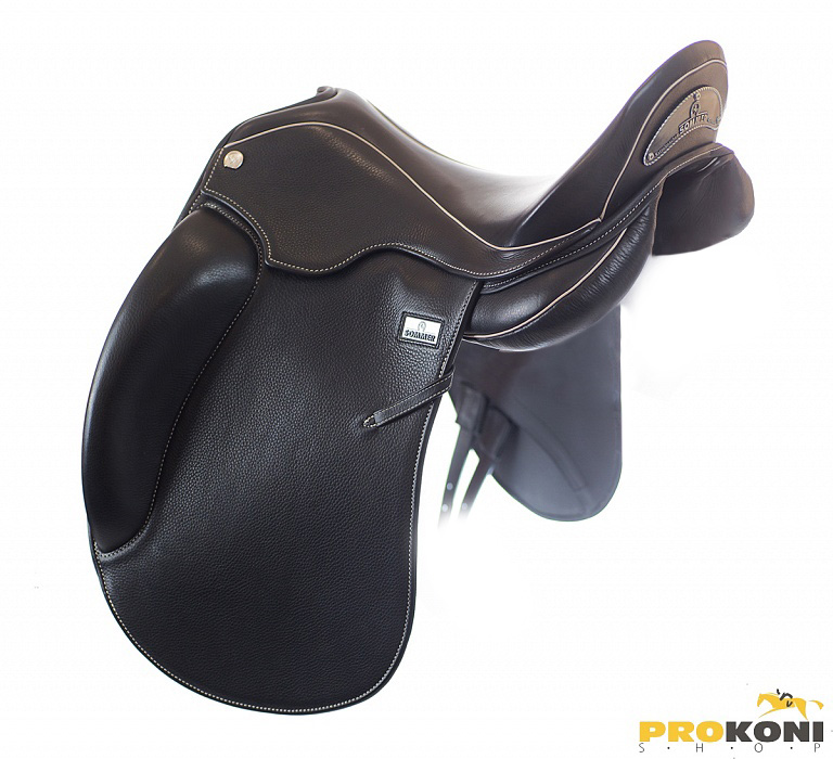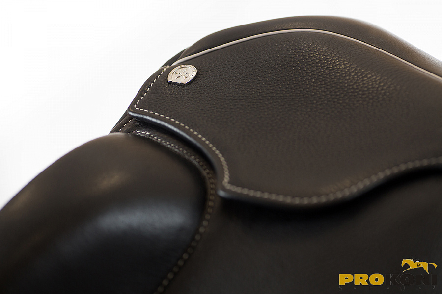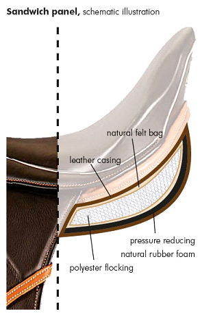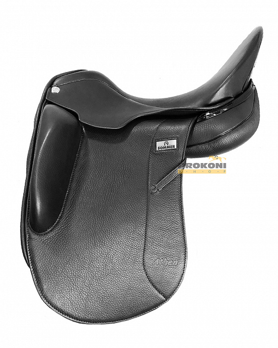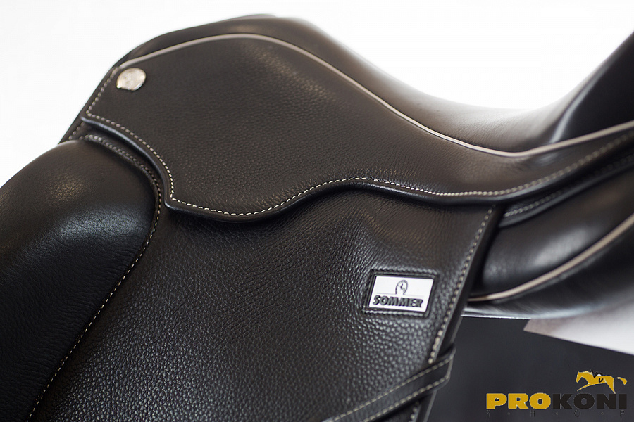 Седло с монокрылом от Sommer с регулируемым синтетическим ленчиком с металлическим усилением, поверхность седла выполнена из телячьей кожи с контрастными швами. Седло имеет V-образные приструги для равномерного прижатия седла, широкий позвоночный канал для лошади и довольно большое пятно контакта со спиной лошади для распределения давления позволят лошади меньше уставать во время тренировок. Подушки с войлочным наполнителем с типом набивки "сэндвич", когда материал в подушках уложен слоями.
