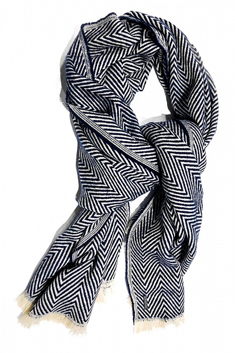 Шарф выпускается в черном, темно-синем и бордовом цветах в зигзагообразную полоску. Маленький металлический шильдик украшает край.