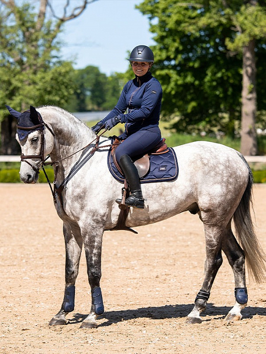 Вальтрап выполнен из устойчивого к загрязнениям атласного материала, простеганного с узором в виде логотипа Equestrian Stockholm В уголке имеется стильный металлический логотип. Вальтрап имеет сетчат...