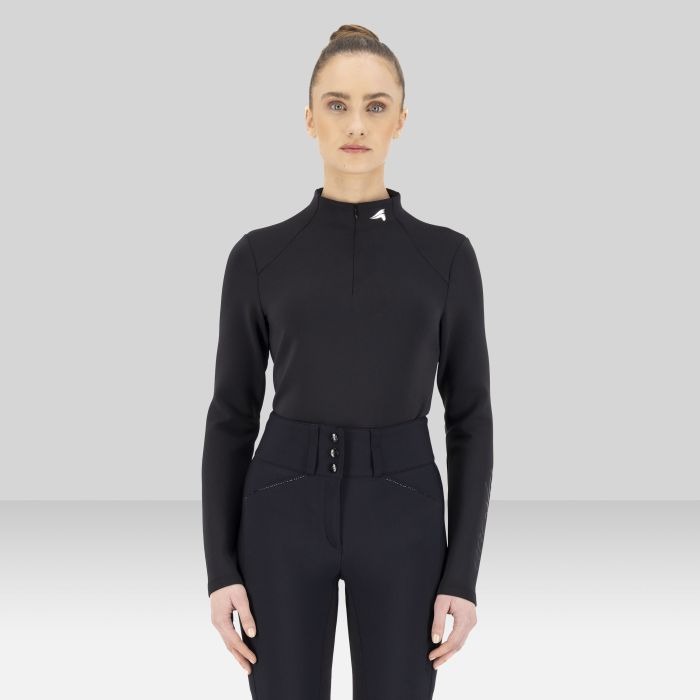 Облегающий топ - новая классика для бриджей как с высокой так и низкой талией. Идеально в качестве тонкого термобелья под жилетку или куртку. Застежка-молния до середины длины и воротник-стойка с усредненной длиной. Лого на рукаве и воротнике добавляет нотку изысканности.
