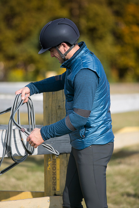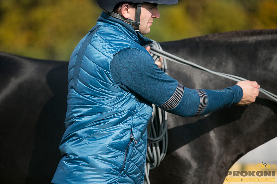 Эластичные вставки по бокам не позволяют жилету сползать наверх пока всадник сидит в седле.