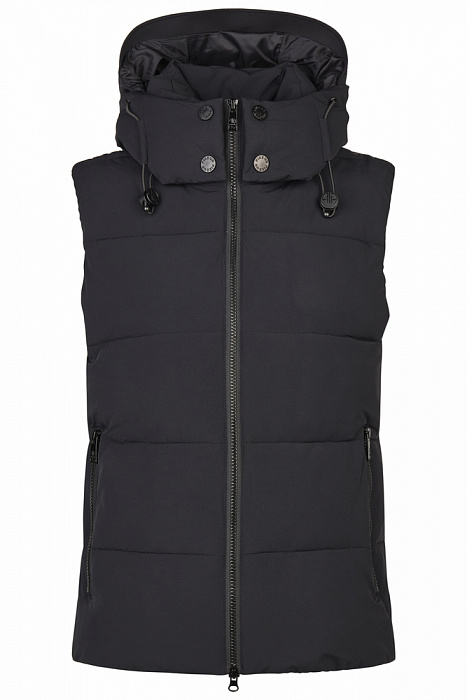 Стеганый дутый жилет со съемным капюшоном выполнен из биэластичной ткани с матовым эффектом.